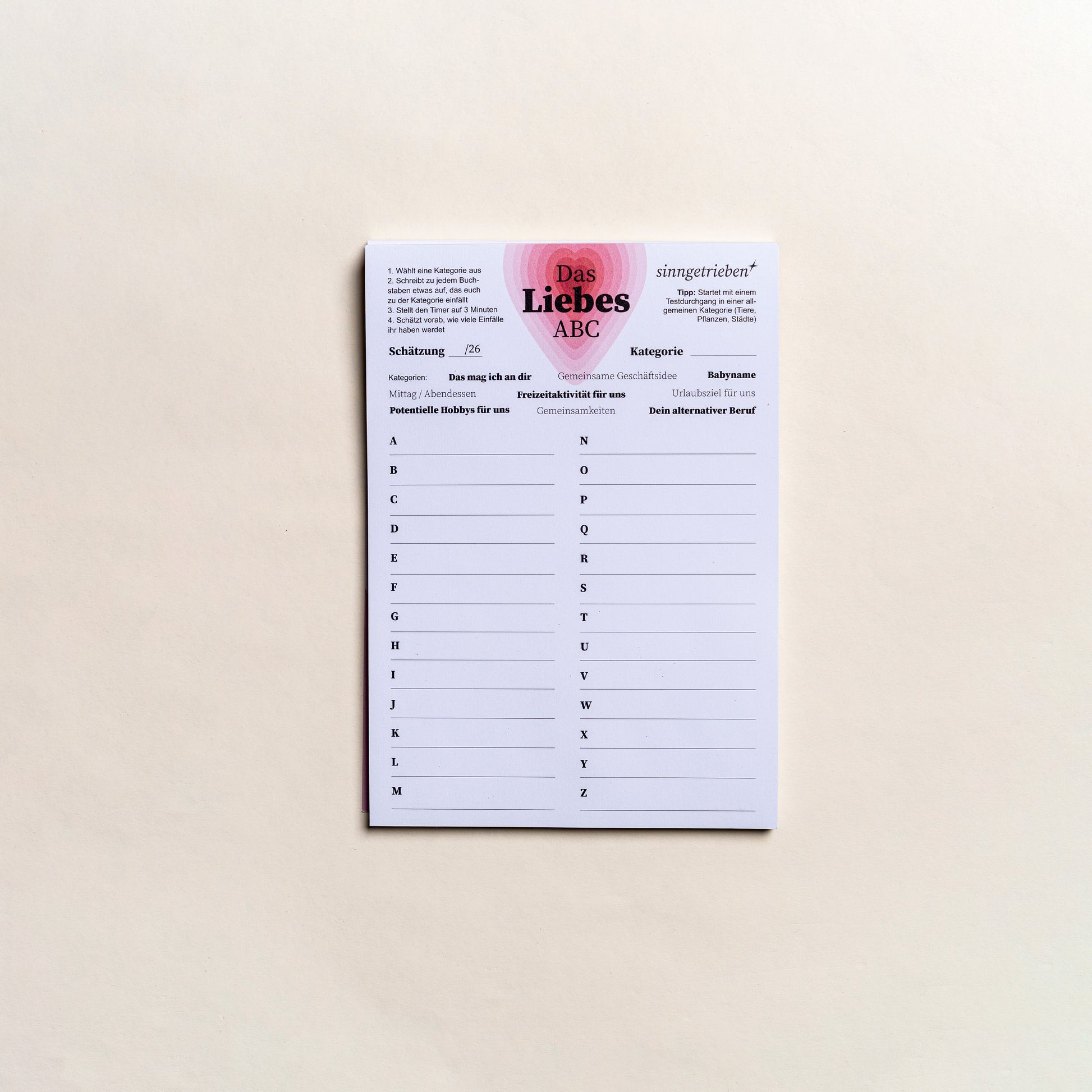 Ihr wählt eine Kategorie, stellt den Timer auf 3 Minuten und schreibt zu jedem Buchstaben von A bis Z passende Begriffe auf.